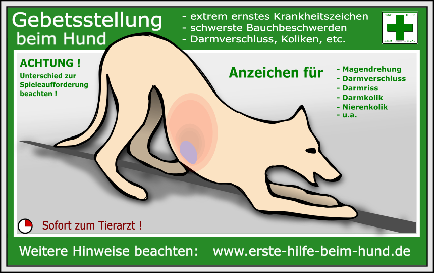 Die Gebetshaltung wird bei der Spielaufforderung und beim Strecken nach dem Aufstehen gezeigt – tritt sie jedoch in unpassenden Situationen auf, sollte unverzüglich eine Tierarzt aufgesucht werden.