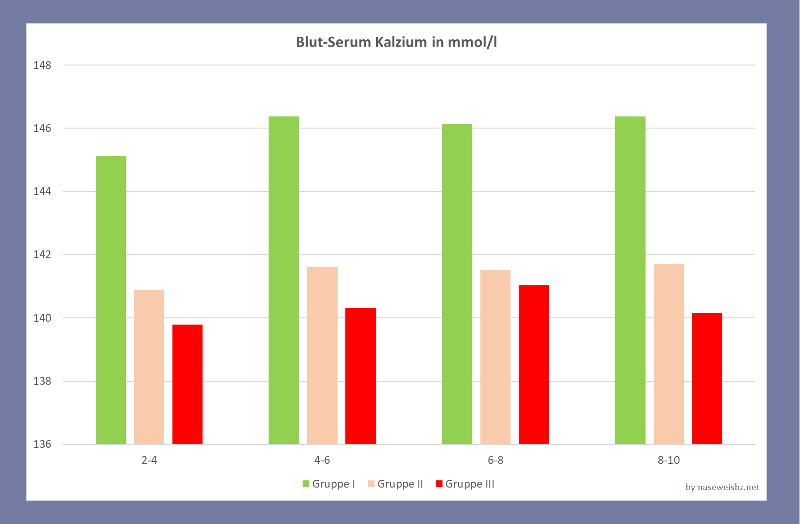 Die Hunde der Gruppe III hatten jeweils signifikant niedrigere Kalziumwerte und höhere Phosphatwerte im Blut als die Gruppen I und II.