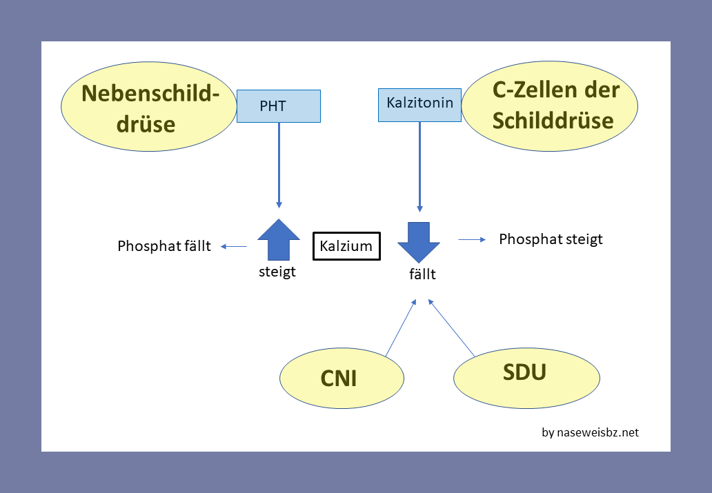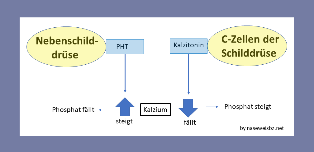 Durch das Parathormon (PHT) der Nebenschilddrüse wird der Kalziumgehalt im Blut erhöht. Hierzu wird zum einen Kalzium aus den Knochen freigesetzt, zum anderen die Rückgewinnung von Kalzium aus dem Primärharn erhöht.