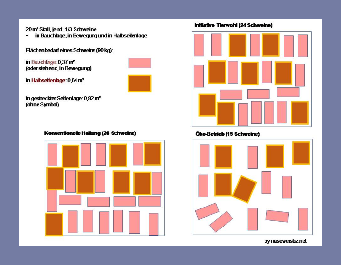 Die gestreckte Seitenlage (Platzbedarf nach Literaturangaben. 0,92 m²) wird in der Tiefschlafphase eingenommen. Schweine liegen zwar gerne zusammen. Der verfügbare Platz muss jedoch ausreichen, um eine entspannte Seitenlage, Kontaktliegen zu den Schweinen der eigenen Wahl und ausreichend Abstand zu Kotplätzen zu ermöglichen (im Idealfall 5 – 15 m). Dies ist bei dem Platzangebot jedoch nicht umsetzbar.