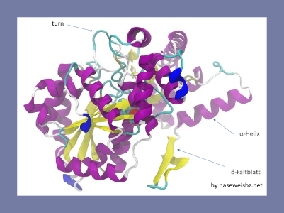 - β-Faltblattstruktur: Ausbildung von Wasserstoffbrücken zwischen verschiedenen AS-Kette, die eng nebeneinander liegen. Dadurch ergibt sich eine Struktur ähnlich einem mehrfach gefalteten Blatt.