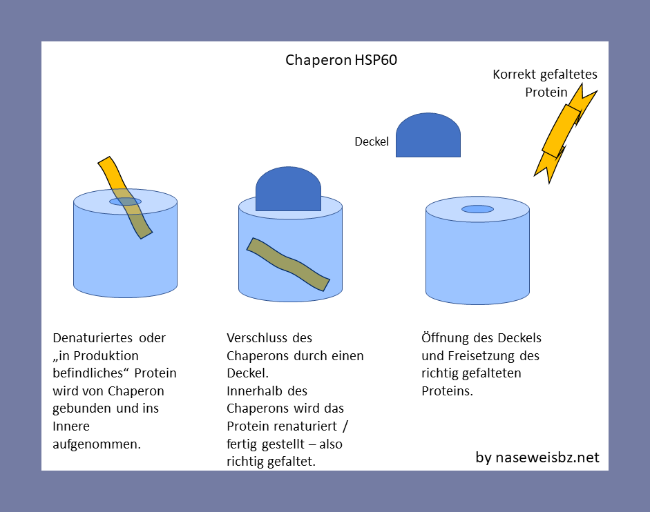 In eukaryontischen Zellen (Zellen mit Zellkern) gibt es daher spezielle Proteine, die verhindern, dass falsch gefaltete Proteine entstehen: die Chaperone (Hitzeschockproteine, HSP). Der Name „Hitzeschockproteine“ ist historisch entstanden: Chaperone wurden nach Einwirkung von Hitze auf Zellen entdeckt. Sie treten zwar vermehrt nach Hitzeeinwirkung auf, sind aber auch im normalen Zellstoffwechsel vorhanden. Chaperone bilden zur Synthese von Proteinen einen geschützten Raum und verhindern so z. B. den Kontakt mit falschen Molekülen. Zum Teil wirken sie auch der Denaturierung durch Erhitzung entgegen.