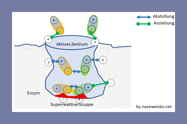 - Orientierungs- und Nachbarschaftseffekt: Im aktiven Zentrum befinden sich oft hydrophobe Aminosäuren und bilden eine Nische, die mit unpolaren (organischen) Lösungsmittel vergleichbar ist. In dieser Nische sind die wenigen polaren Seitengruppen der AS superreaktiv. Die Moleküle, die durch ein Enzym z. B. verbunden werden sollen, werden zudem im aktiven Zentrum in unmittelbare Nachbarschaft und in die richtige Orientierung gebracht.