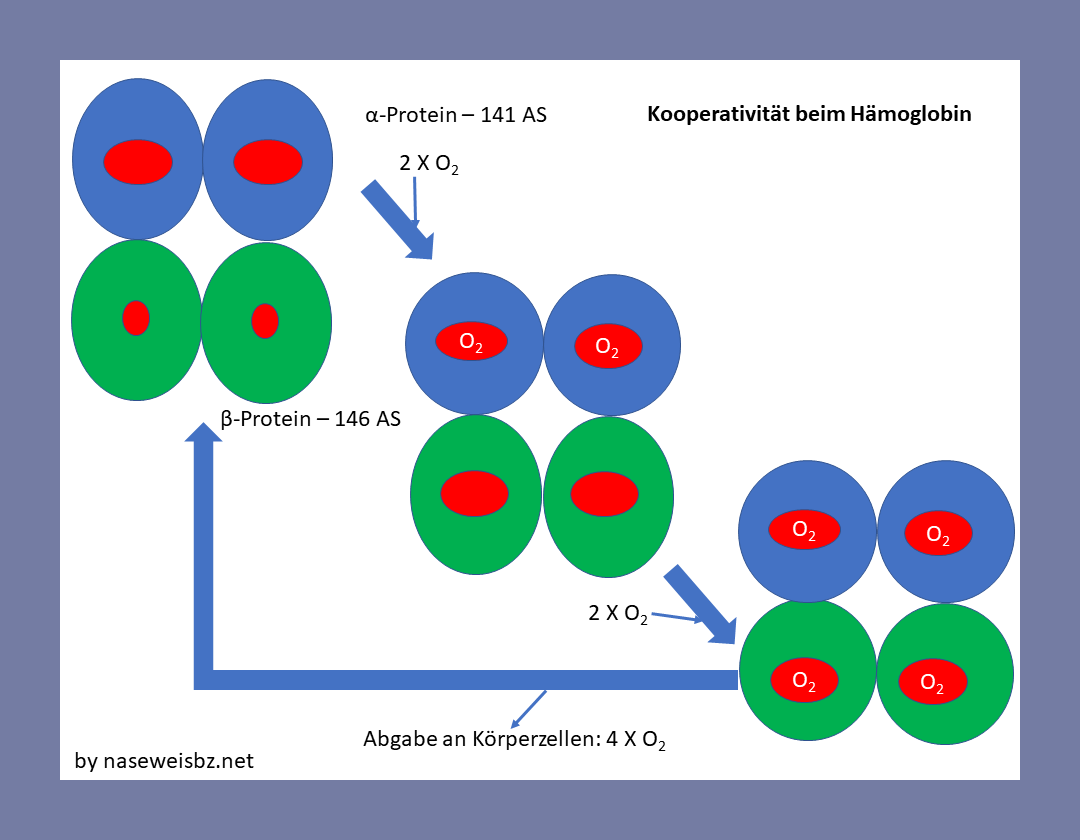 Der Sauerstoff wird zunächst an die α-Einheiten gebunden. Dadurch verändert sich die räumliche Struktur der α-Einheiten und die Sauerstoffbindungskapazität der β-Einheit erhöht sich. Diese binden nun ebenfalls Sauerstoff. Wenn der Sauerstoff ins Körpergewebe abgegeben wurde, wird die ursprüngliche räumliche Struktur wieder eingenommen und es kann wieder Sauerstoff gebunden werden.
