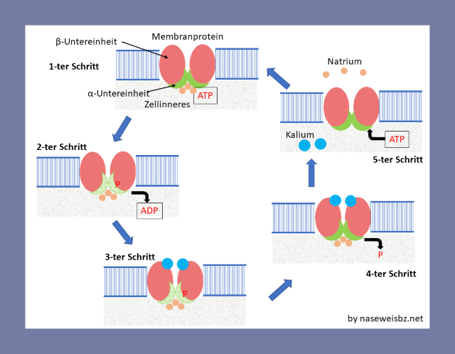 - Natrium wird nach außen abgegeben, Kalium nach innen. Ein neues (energieaufwändig produziertes) ATP-Molekül bindet wieder am Membranprotein.