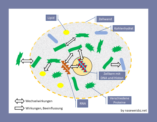 Leben kann also nur existieren, wenn Erbsubstanz und Proteine gezielt zusammenarbeiten. Dazu muss die Erbsubstanz einen sinnvollen „Anweisungstext“ liefern und die richtigen Proteine an den richtigen Stellen im geeigneten Milieu „arbeiten“.