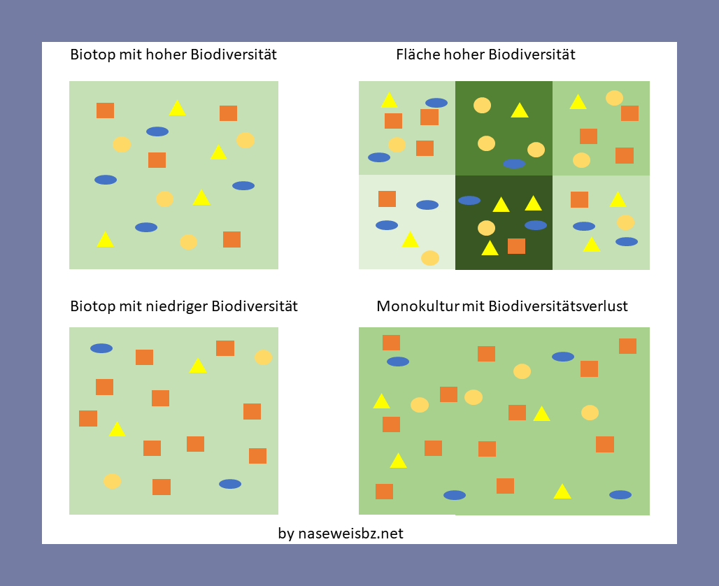 Ein Biotop mit 4 Arten, die mehr oder weniger gleichstark vertreten sind, hat eine höhere Biodiversität als ein Biotop, in dem zwar genauso viele Arten und in der Summe genauso viele Individuen vertreten sind, aber die meisten Arten nur in geringer Individuenzahl vorkommen.