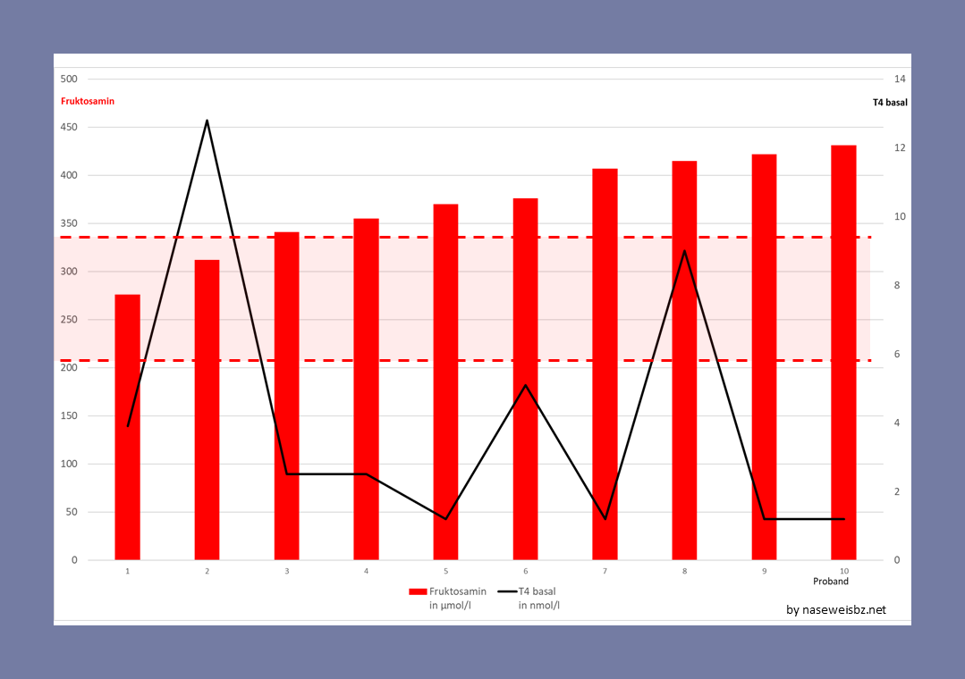 Möglicherweise spielt es bei der Entwicklung höherer Fruktosaminwerte auch eine Rolle, wie lange die Schilddrüsenunterfunktion bereits besteht: Je länger die SDU vorhanden ist, desto wahrscheinlicher sind vermutlich höhere Fruktosamin-Werte.