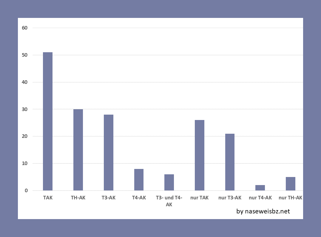 Positive T4-AK bei positivem TAK wurde bei 14 % SDU-kranker Hunde und 11 % SDU-gesunder Hunde festgestellt. Bezogen auf 1.000 Hunde hätten somit 250 Hunde positive T4-AK-Werte.