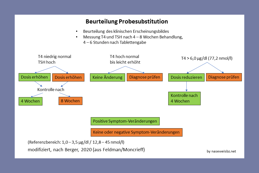 Teilweise wird zu Abklärung eine Probesubstitution vorgenommen. In der Studie wird zur Beurteilung einer Probesubstitution das Beurteilungsschema von Feldman / Moncrieff dargestellt. Dort wird bei ausbleibendem T4-Anstieg eine Dosiserhöhung mit Nachkontrolle empfohlen. Bei Ausbleiben positiver Veränderungen trotz gestiegenem T4-Wert sollte die Diagnose überprüft werden. Eine weitere Dosiserhöhung ist hingegen nicht anzuraten (s. o. – erhöhte Ausscheidung und verminderte Halbwertzeit). Sowohl bei einer Probesubstitution als auch bei einer Fehldiagnose können, wie zuvor erläutert, bereits geringe Dosen zu erhöhten T4-Werten und Überfunktionsanzeichen führen.