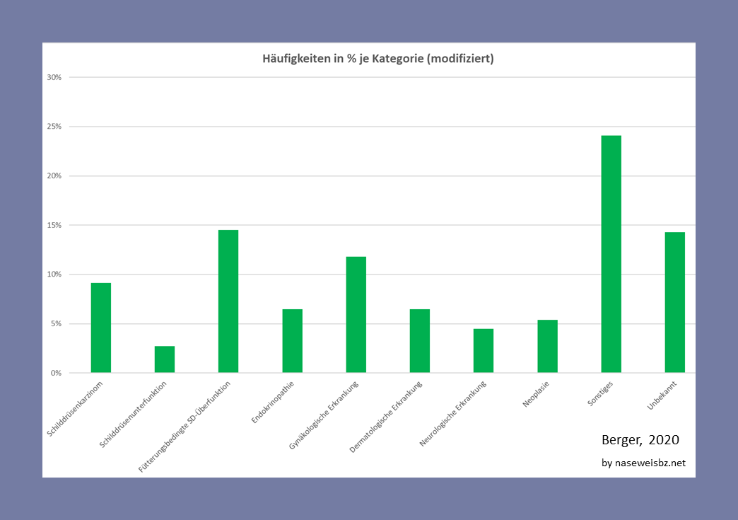 Berücksichtigt man bei der Schilddrüsenunterfunktion lediglich die Hunde, deren T4 über dem empfohlenen Maximal-Wert von 70 nmol/l lagen, sind die fütterungsbedingten und gynäkologischen Ursachen sowie die Schilddrüsenkarzinome die häufigsten erkennbaren Gründe für zu hohe T4-Werte.