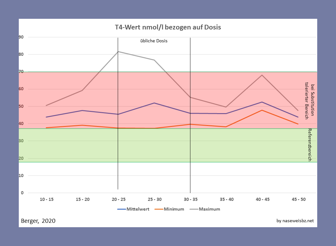Aufgrund dieser Einflüsse kann kein eindeutiger Zielwert für die Dosis und den T4-Wert festgelegt werden. Der Blutwert sollte innerhalb oder leicht über dem Referenzwert liegen. Bei einem Referenzbereich von 17 – 37 nmol/l können – insbesondere bei 1x täglicher Hormongabe – Werte bis rd. 70 nmol/l toleriert werden.