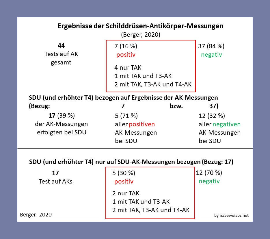 In der Studie wurden bei insgesamt 44 Hunden die Antikörper (TAK, T4-AK, T3-AK) gemessen. Bei 37 (84 %) waren die AKs negativ, bei 7 (16 %) positiv (über dem Referenzbereich, Messwerte nicht angegeben). 2 der Hunde mit positiven AKs wurden nicht der Kategorie SDU zugeordnet und waren nur TAK-positiv. Davon hatte ein Hund ein Schilddrüsenkarzinom, der andere Larynxparalyse. Ob hier jeweils auch eine SDU (diagnostiziert oder undiagnostiziert) vorlag, ging aus den ausgewerteten Unterlagen nicht hervor.