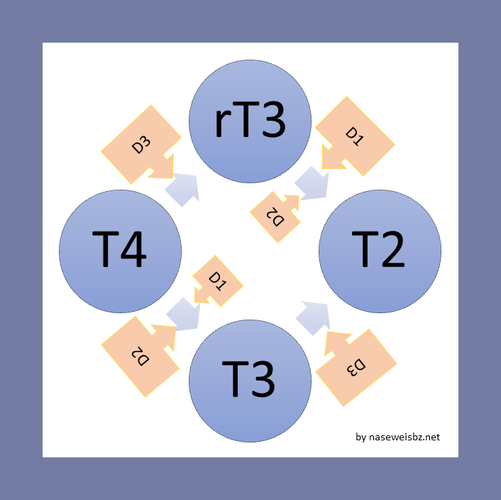 - T4 nicht in das aktive T3, sondern in das inaktive rT3 umgewandelt wird (beteiligt: D3, Low-T3-Syndrom),