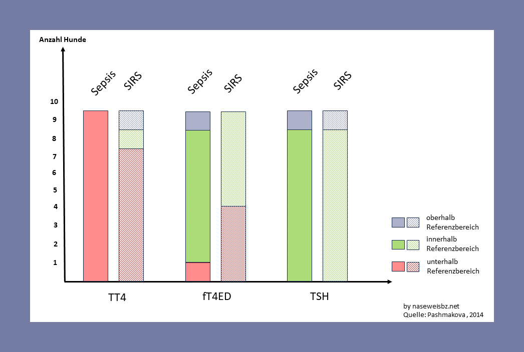 Bei allen Hunden mit einer Sepsis waren die TT4-Werte erniedrigt, bei SIRS nur bei 7 von 9. fT4ED war erniedrigt, aber bei 12 von 18 Hunden noch innerhalb des Referenzbereiches. Der fT4ED lag bei einem Hund mit Sepsis und bei 4 Hunden mit SIRS unterhalb des Referenzbereichs. Bei einem Hund mit Sepsis lag der fT4ED über dem Referenzbereich.