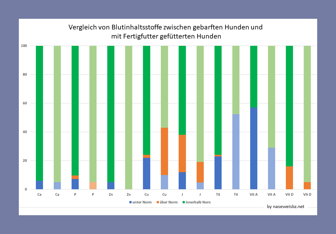 Hajek (2022) untersuchte die Aussagekraft bestimmter Faktoren (speziell des BARF-Profils von Synlab) im Vergleich mit computergestützten Rationsberechnungen. Kurz gesagt: Die Blutwerte standen in der Regel in keinem Zusammenhang mit der anhand der Rationsberechnungen ermittelten Versorgungslage. Im wesentlichen ist das darauf zurückzuführen, dass der Blutspiegel vieler Substanzen konstant gehalten wird und in Wechselwirkung mit den Körperspeichern (Knochen, Leber..) steht. Bevor Mangelerscheinungen im Blut nachzuweisen sind, müssen diese Körperspeicher geleert werden. Zudem stellt ein Blutbild immer eine Momentaufnahme dar. Wie am Beispiel Jod erläutert, kann bei einem wöchentlichen „Jodtag“ der Jodgehalt im Blut an verschiedenen Tagen sehr unterschiedlich sein.