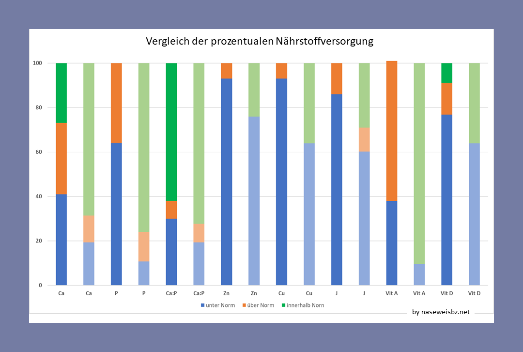 Typische Nährstoffungleichgewichte, die in vielen Studien festgestellt wurden, betreffen vor allem die Versorgung mit Kalzium, Phosphor, Kupfer, Zink, Jod, Mangan, Selen, Eisen, Vitamin A und D.